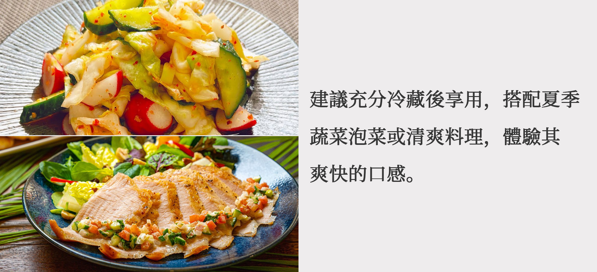 香氣較為克制,帶有淡淡的甘味,加上適當的酸度。幾乎沒有澀味和苦味,非常爽快。無論是搭配夏季蔬菜沙拉、醃漬物這類簡單菜餚,還是對抗夏季倦怠的滋補料理都非常合適。