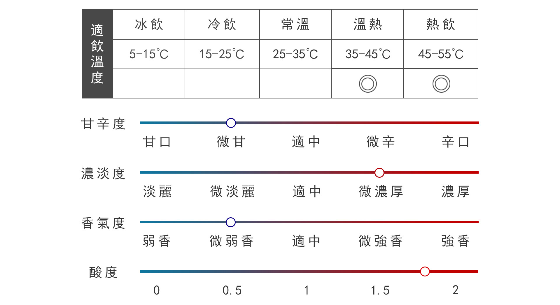 帶輕柔的陳年香氣,入口呈現平衡的酸味和甘甜味,梅乾、堅果宜人味道,酒體順滑,餘韻清脆,建議以常溫或加熱至40℃享用。